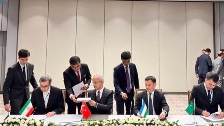 伊朗、阿塞拜疆和俄罗斯的铁路官员在签署关于加强南北国际运输走廊合作的谅解备忘录时合影