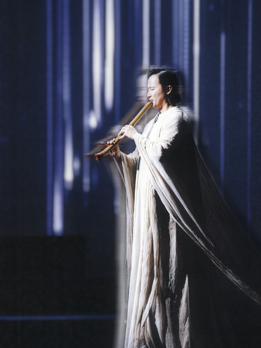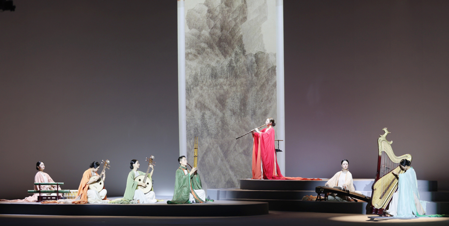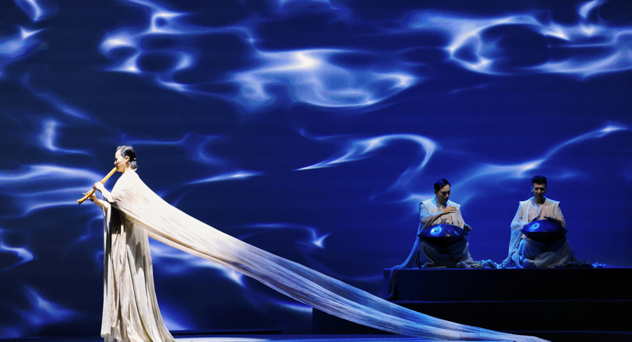 开场曲《汲古》以距今九千年的骨笛开场,这件有据可考的最古老的吹管乐器,以悠远拙朴的声线,破除混沌的开端,仿佛回到人类文明的黎明之时、初心之际。接着,篪、箫、笛等传统吹管乐器次第登场,让“天地玄黄,宇宙洪荒”可听、可见。《水行》则巧妙地融合了古老的尺八与现代手碟,诠释“上善若水”的东方哲学。《火舞》则集结多国打击乐器,跨越文化藩篱,共同奏响生命之火的炽热与永恒……古筝独奏《墨戏》中,古筝如挥毫泼墨,舞者似灵动笔锋,王羲之《兰亭序》的巨幅书法投影缓缓铺陈,三者共同构建起“仰观宇宙之大,俯察品类之盛”的格局。