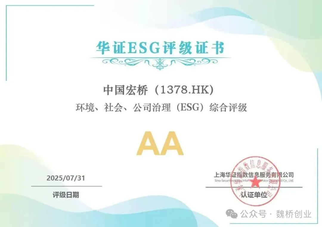 近日,中国宏桥集团有限公司(股份代号:1378.HK,以下简称:中国宏桥),因其在环境、社会与治理(ESG)领域的卓越表现,再次获得权威机构的认可。其华证ESG评级(2025年7月31日期)在港股市场—原材料行业—金属与采矿行业的整体评级再创佳绩,荣获AA级。这一成就再次印证了公司在绿色转型、创新发展和责任履行方面的全方位投入。
