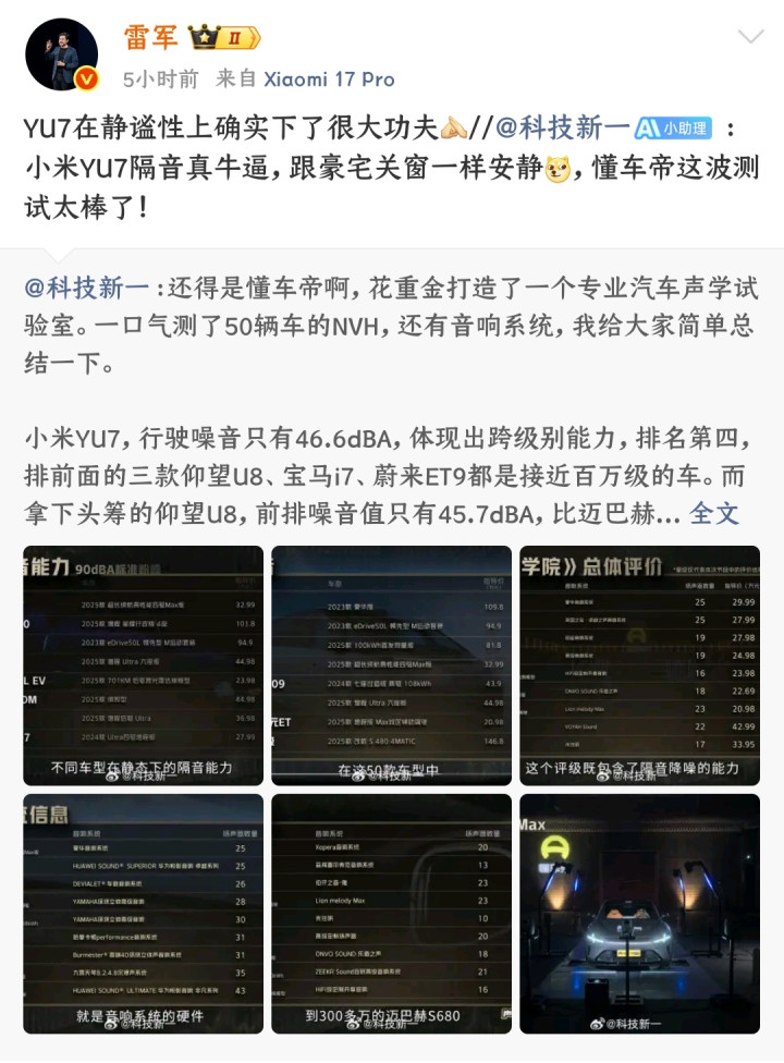 动态行驶噪音测试中,小米YU7前排噪音值为46.6dBA,位列榜单第四,仅次于仰望U8(45.7dBA)、宝马i7(46.2dBA)、蔚来ET9(46.4dBA),成绩超越迈巴赫S级等传统豪华车型。这一数据证明其静谧性并非局限于静态场景,在高速行驶、路况颠簸等复杂工况下,仍能为驾乘者提供高端静谧体验。小米集团创始人雷军转发该测试成绩并表态,确认YU7在静谧性研发环节投入大量资源,其电动吸合门等配置也进一步提升了驾乘静谧质感。