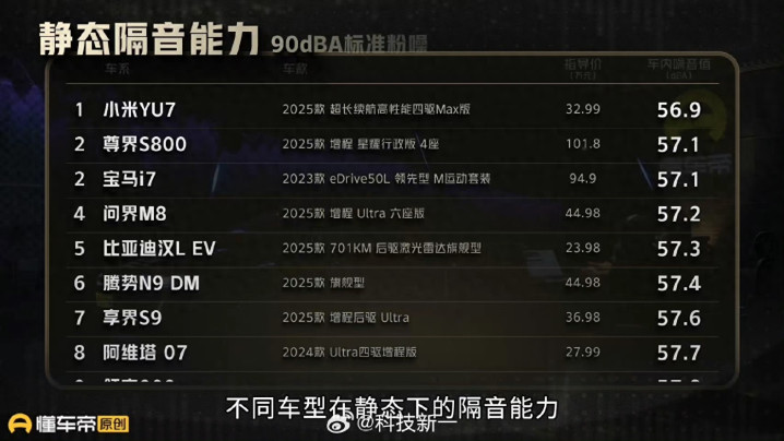 12月上旬,懂车帝发布最新车型隔音测试榜单,小米汽车首款SUV车型YU7交出亮眼成绩单,以32.99万元的定价实现对百万级豪华车型的隔音性能反超配资财经网,不仅拿下静态隔音榜首,动态NVH表现也跻身前列,成为30万级车型中的静谧性标杆。